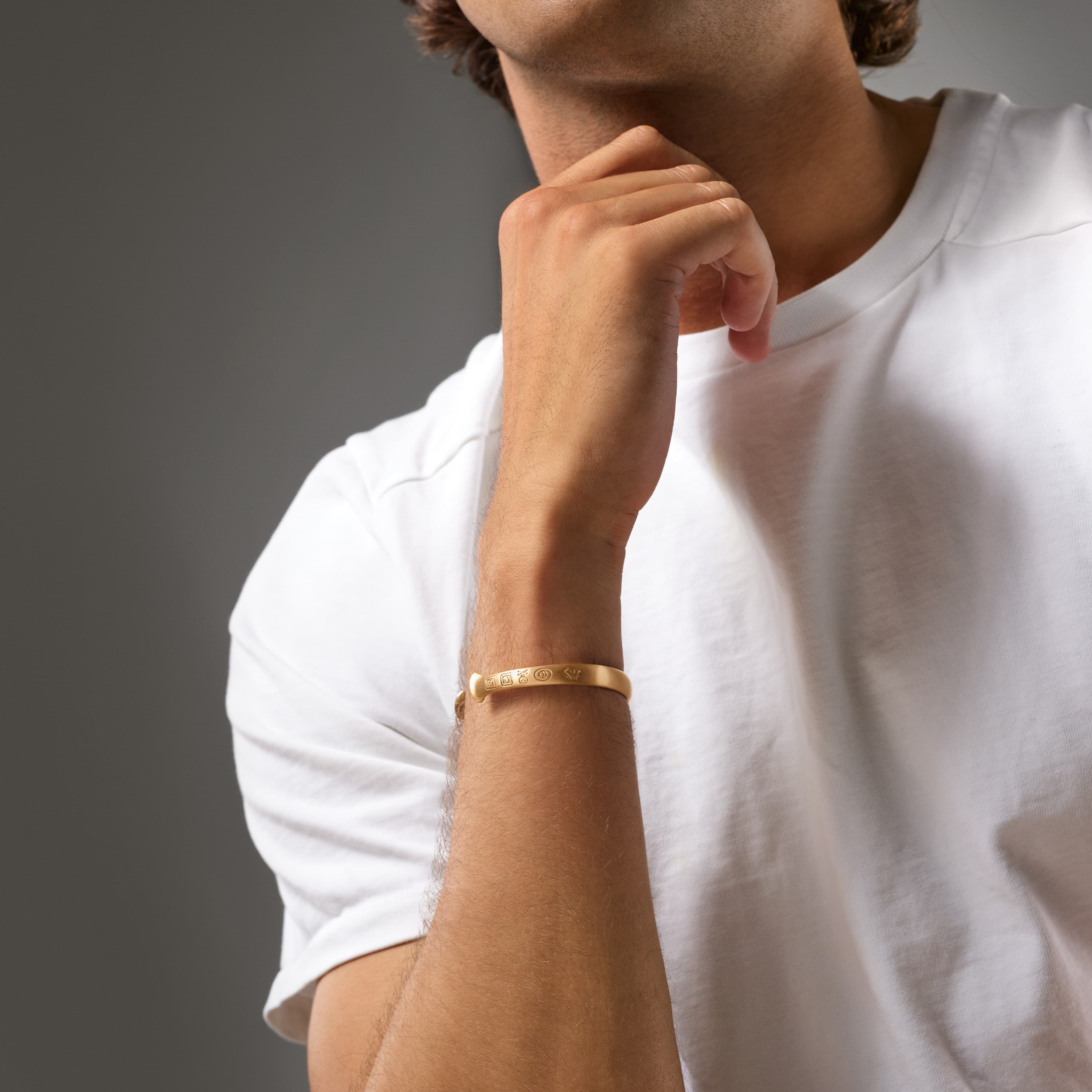 Der von Charlotte Lynggaard entworfene Julius armreif ist aus 750/- Gelbgold gefertigt und mit fünf symbolischen Stempeln verziert. Goldschmiedemeister bürsten die Oberflächen von Hand, um ein texturiertes Finish zu erzielen.