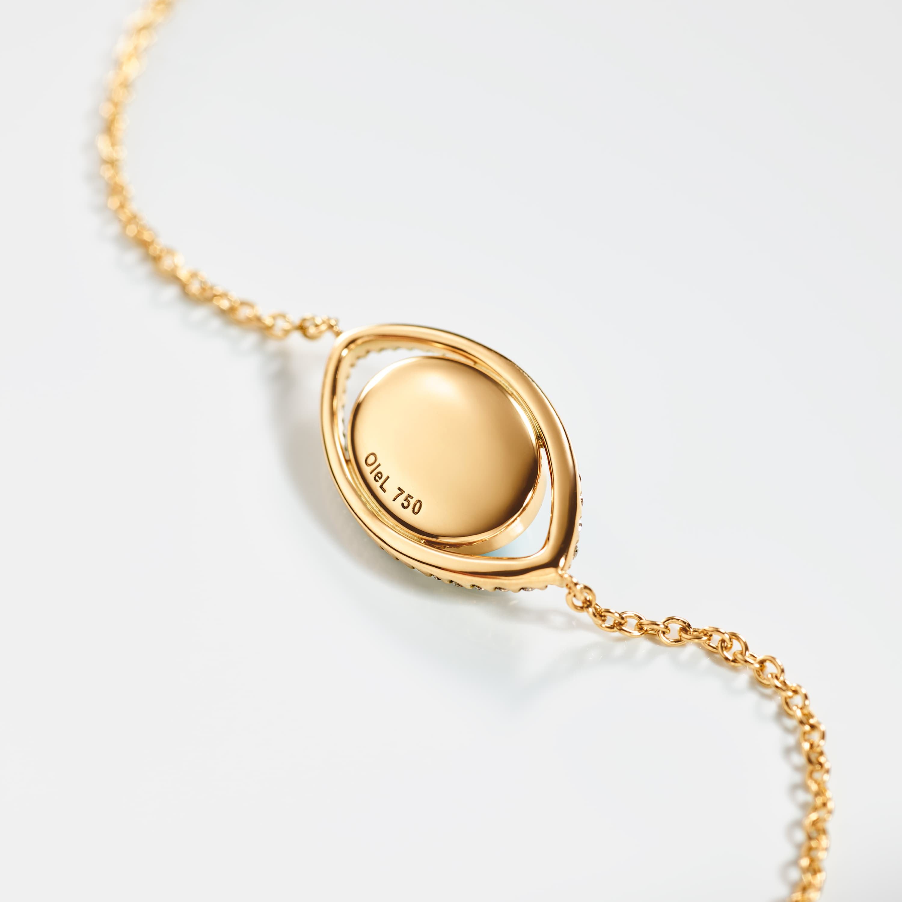 Dieses Armband wurde von Charlotte Lynggaard entworfen und ist mit einem Evil Eye verziert. Der Evil Eye ist aus Tigerauge, Türkis und Onyx gefertigt und von 42 Diamanten mit insgesamt 0,25 Karat umgeben. TW/VS. Das Armband, Anker 30, ist aus 18k Gelbgold gefertigt. Es misst 18 cm und verfügt über Ösen, sodass es bei 15, 16, 17 oder 18 cm getragen werden kann. Das verstellbare Ende des Armbands ist mit einer zierlichen Sternschnuppe verziert, die aus 6 Diamanten mit insgesamt 0,03 Karat besteht. TW VS, für einen besonders eleganten Glanz. Von Goldschmiedemeistern in Handarbeit gefertigt. Teil der Lotus-Kollektion.