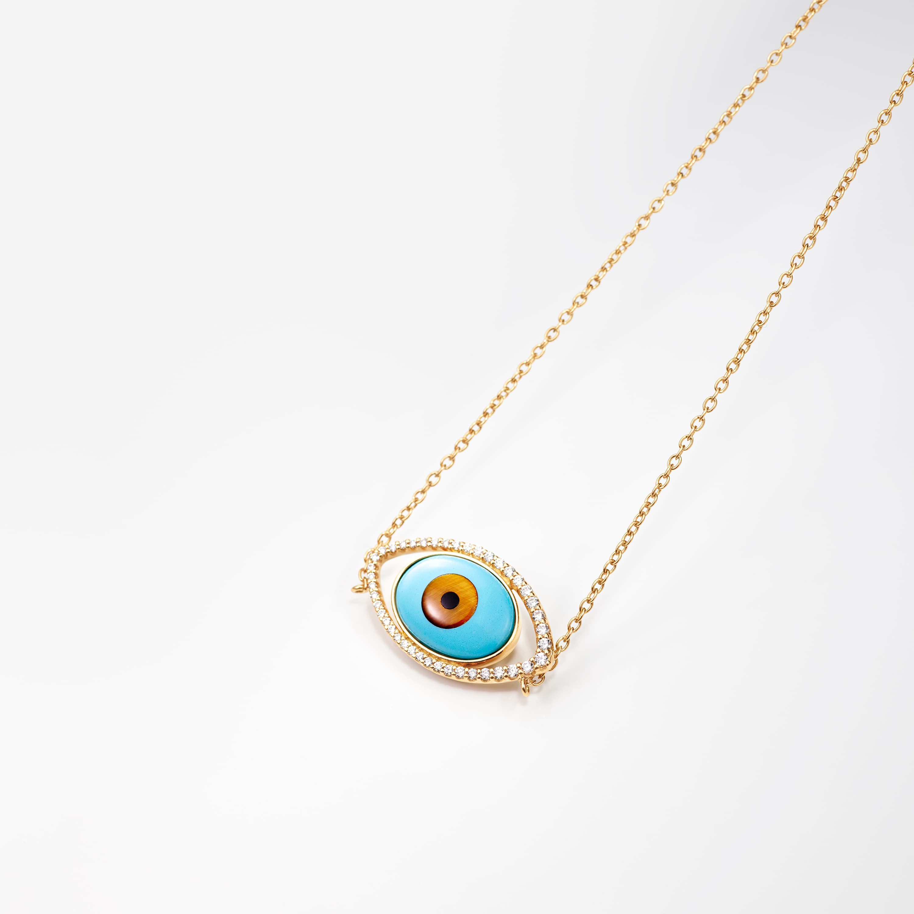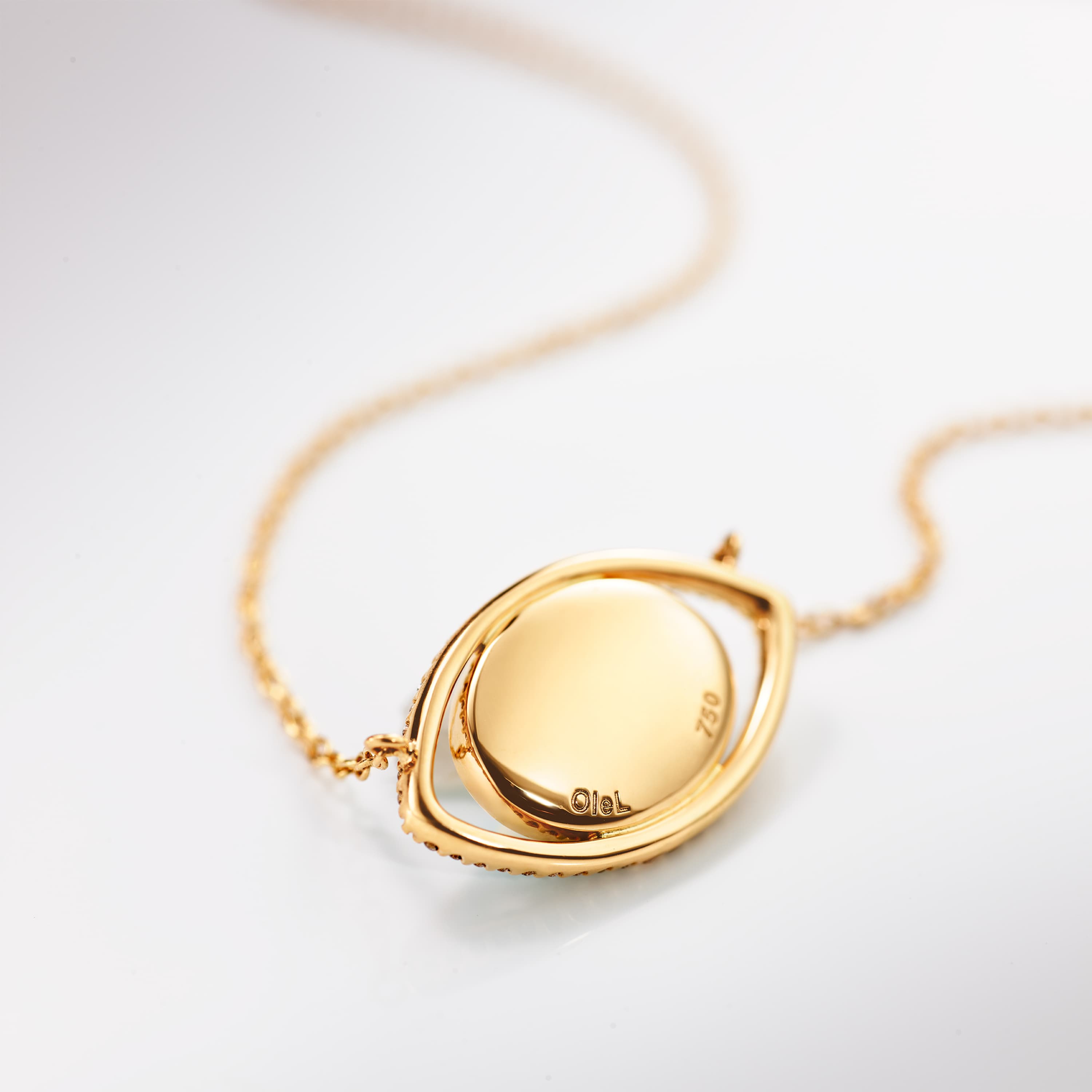 Dieses von Charlotte Lynggaard entworfene Collier ist mit einem Evil Eye verziert. Der Evil Eye ist aus Tigerauge, Türkis und Onyx gefertigt und von 42 Diamanten mit insgesamt 0,25 Karat umgeben. TW/VS. Die Kette, Anker 30, ist aus 18k Gelbgold gefertigt. Es misst insgesamt 45 cm und verfügt über Ösen, sodass es bei 40, 42 oder 45 cm getragen werden kann. Das verstellbare Ende des Colliers ist mit einer zierlichen Sternschnuppe verziert, die aus 6 Diamanten mit insgesamt 0,03 Karat besteht. TW VS, für einen besonders eleganten Glanz. Von Goldschmiedemeistern in Handarbeit gefertigt. Teil der Lotus-Kollektion.