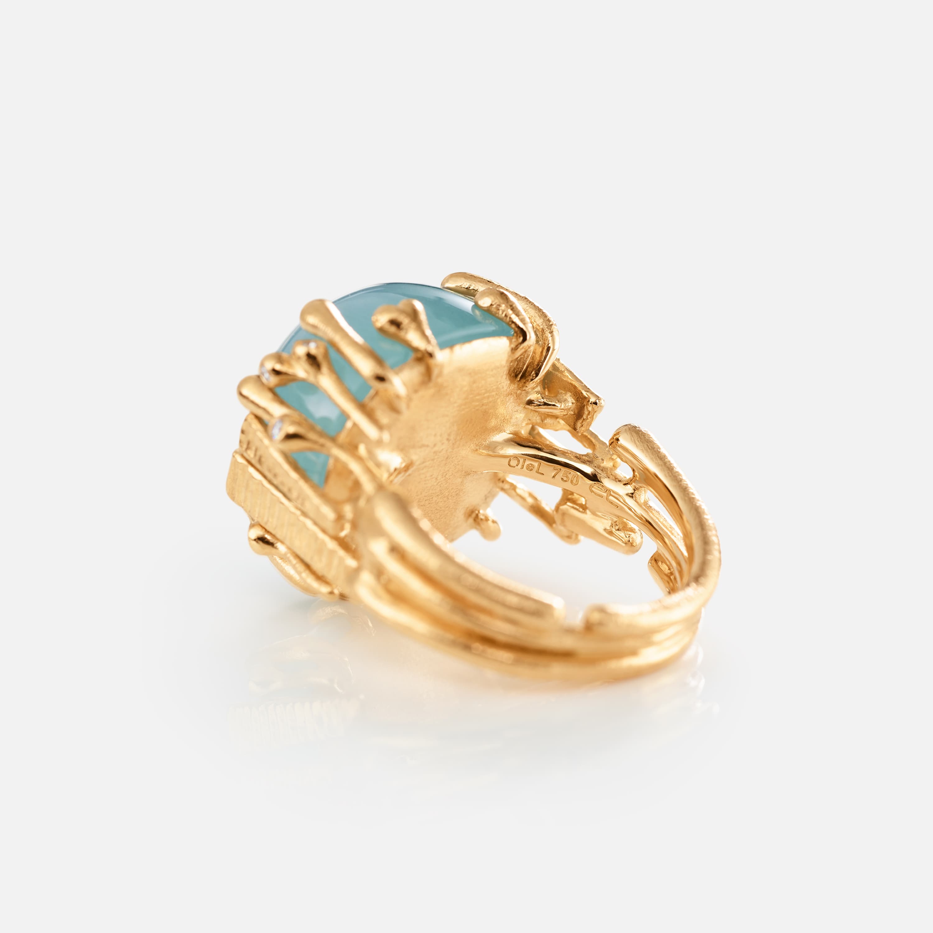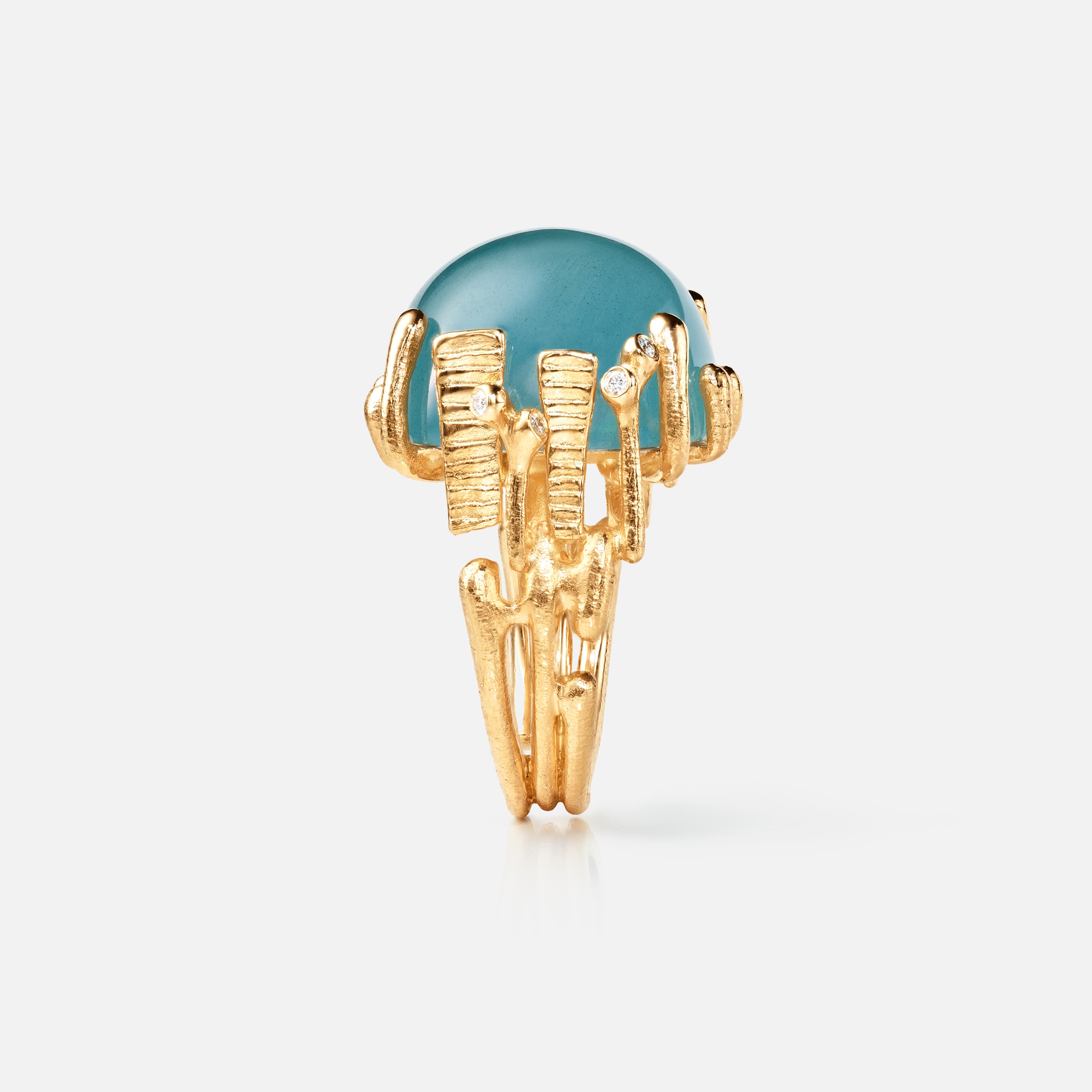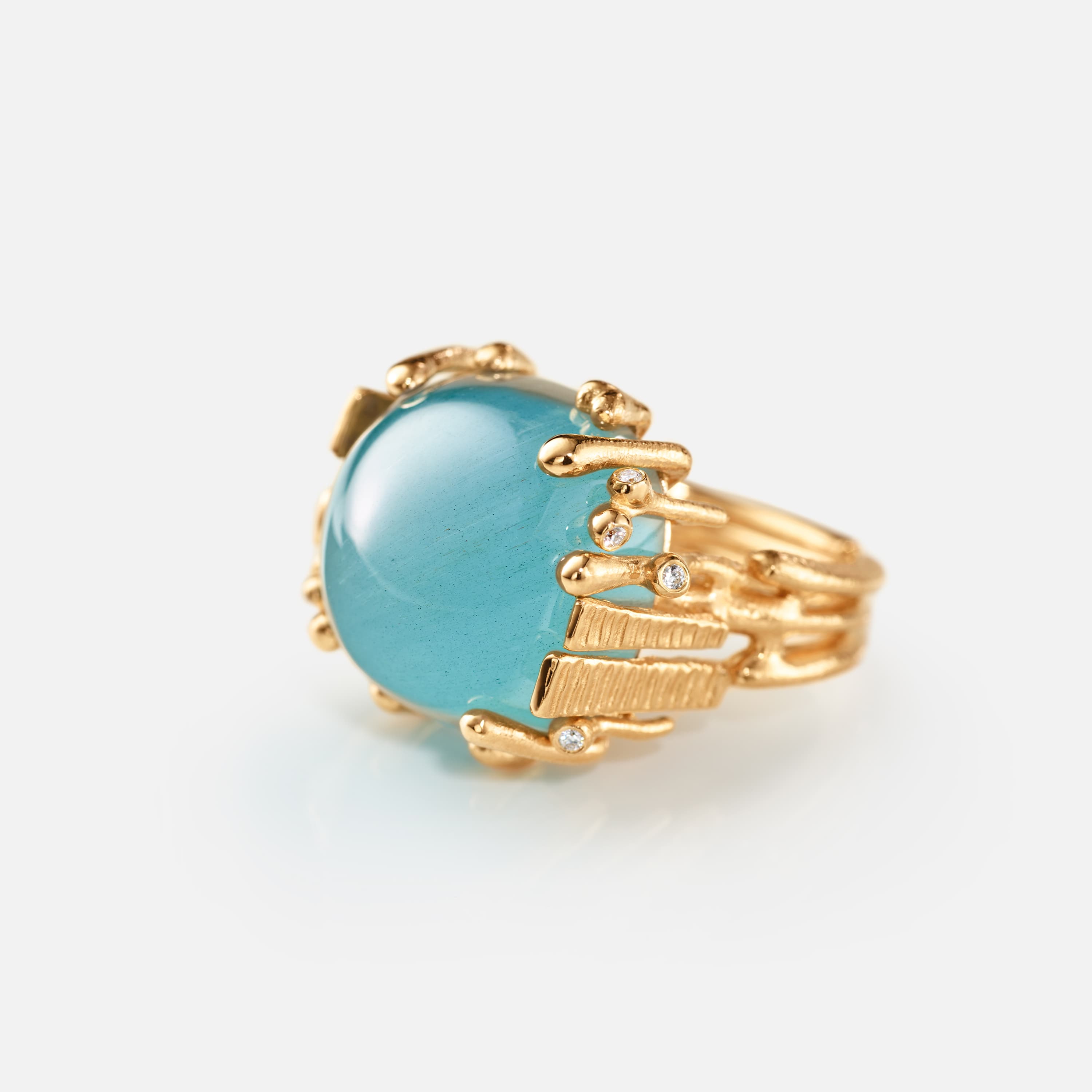 Der von Charlotte Lynggaard entworfene BoHo ring groß ist aus 750/- Gelbgold handgearbeitet, verziert mit einem 31 carat, 18x18mm blauen Aquamarin und acht Diamanten 0,06 carat TW. VS. Die AGL-Zertifikatsnummer des Turmalins ist mit Laser in den Stein graviert. Die gehämmerten und polierten Goldoberflächen sind von Goldschmieden handgefertigt. Teil der BoHo Collection.