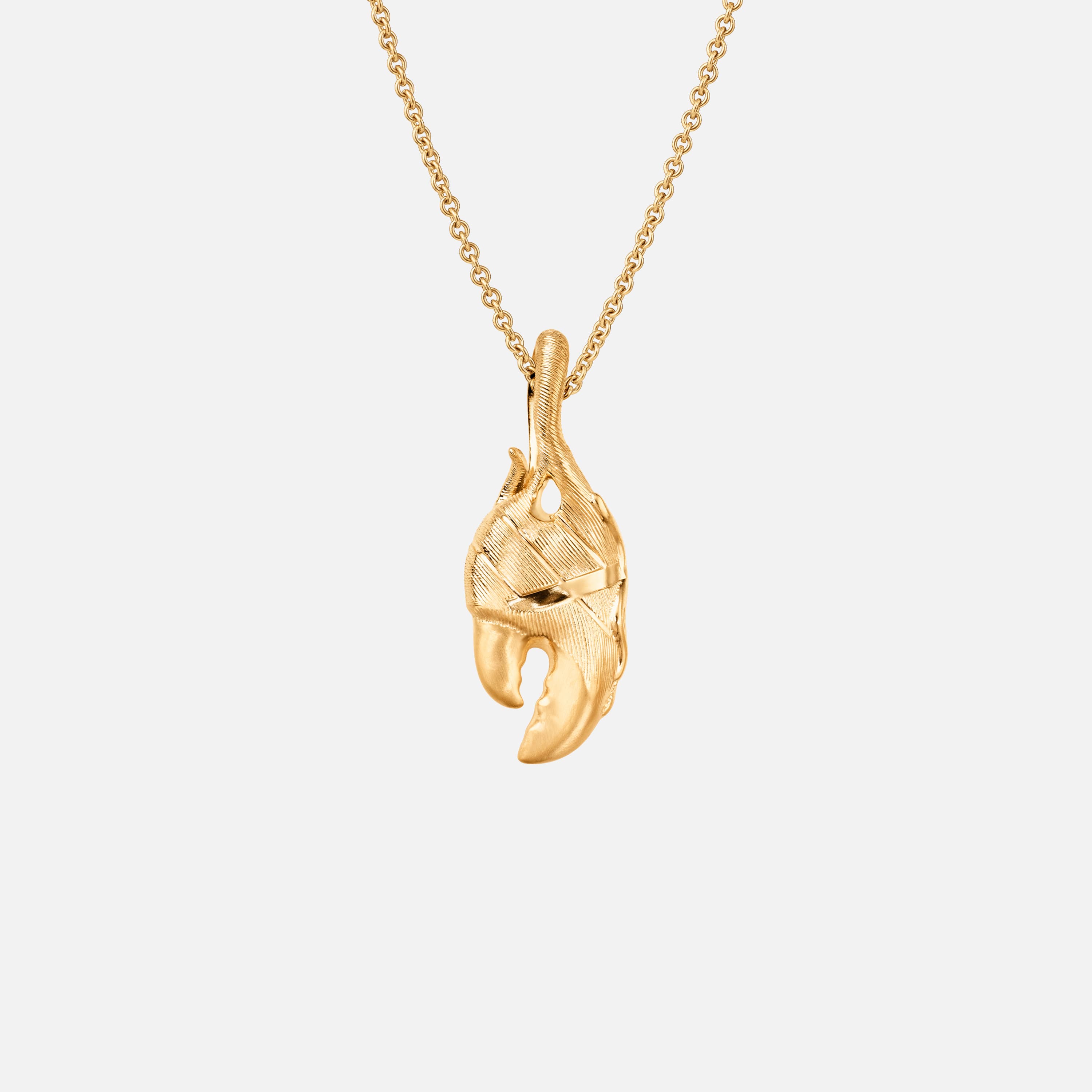 The set consists of a Claw pendant medium and an Anchor 40 chain. The Claw pendant is designed by Sofia Lynggaard Normann and crafted from 18 karat yellow gold. It features an intricate texture, combining satinised, polished, sandblasted, and brushed surfaces all meticulously finished by master goldsmiths. The pendant measures 3.1 cm in length. It is paired with the Anchor 40 collier, designed by Charlotte Lynggaard. The clasp is crafted from 18 karat yellow gold with a polished surface. The collier can be adjusted to three lengths: 60 cm, 50 cm, or 45 cm. Part of The Young Fish Collection.