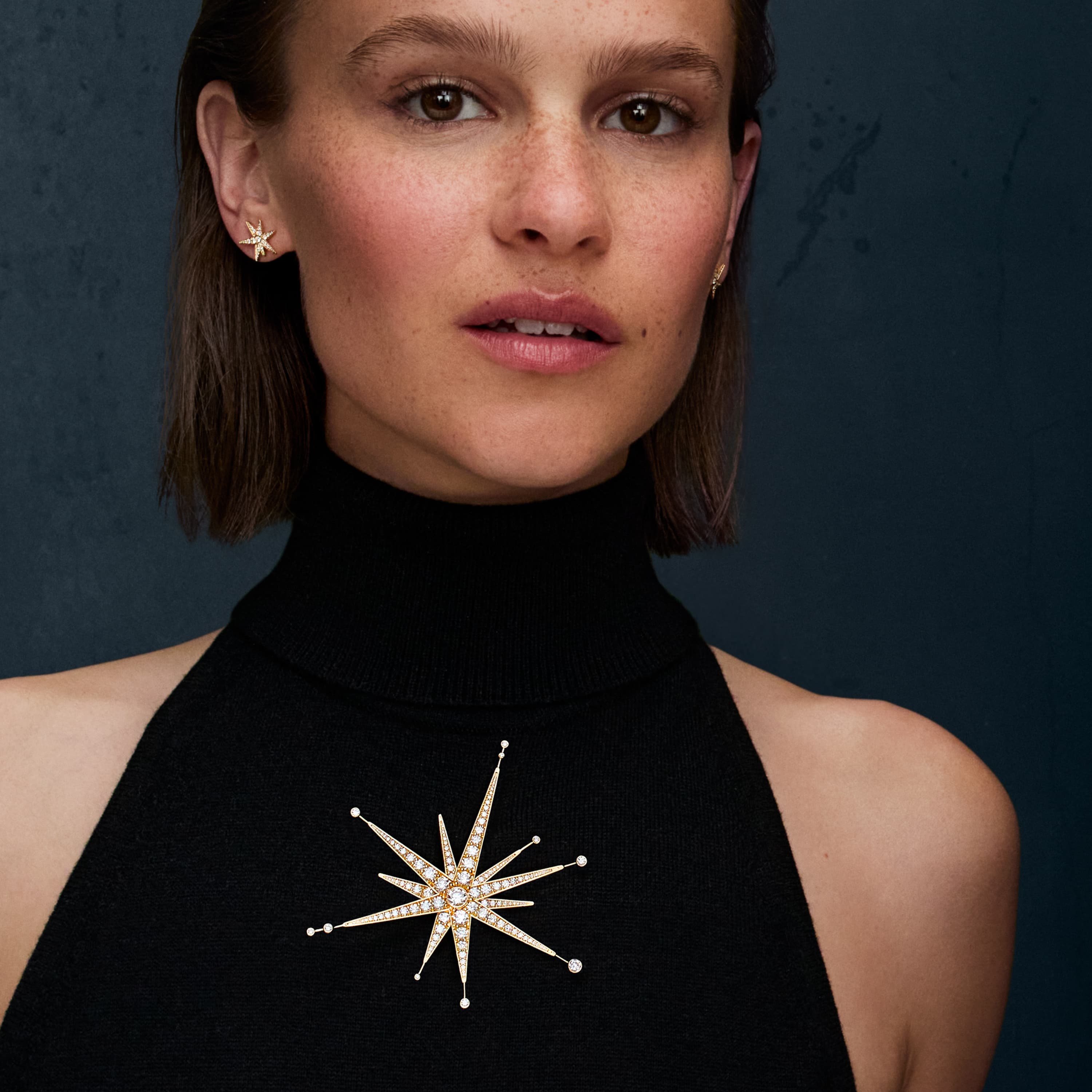 Designed by Charlotte Lynggaard, the Funky Stars brooch is crafted in 18 karat yellow gold set with 148 diamonds totalling 8.38 carat. TW VS. Diamonds of varying sizes come together in a captivating, one-of-a-kind formation. Handcrafted by master goldsmiths. Part of The Funky Stars Collection.