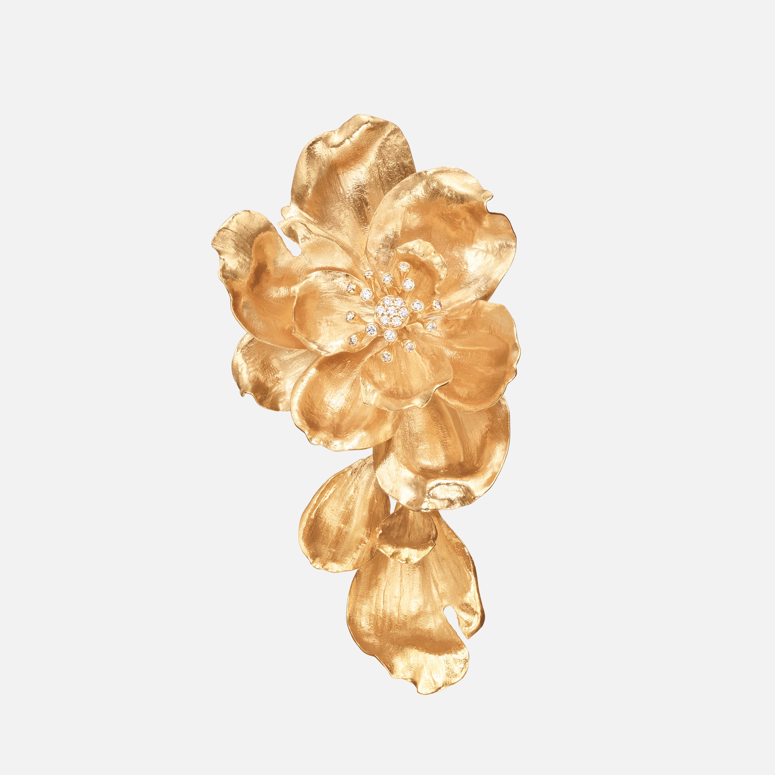 Designed by Charlotte Lynggaard, this Wild Rose earclip is crafted from 18 karat yellow gold and set with 22 diamonds totalling 0.18 ct. TW VS. Master goldsmiths carve and hammer the gold surfaces by hand, and polish the ridges to create contrast. Available in left and right. Sold as a single piece. Part of The Wild Rose Collection.