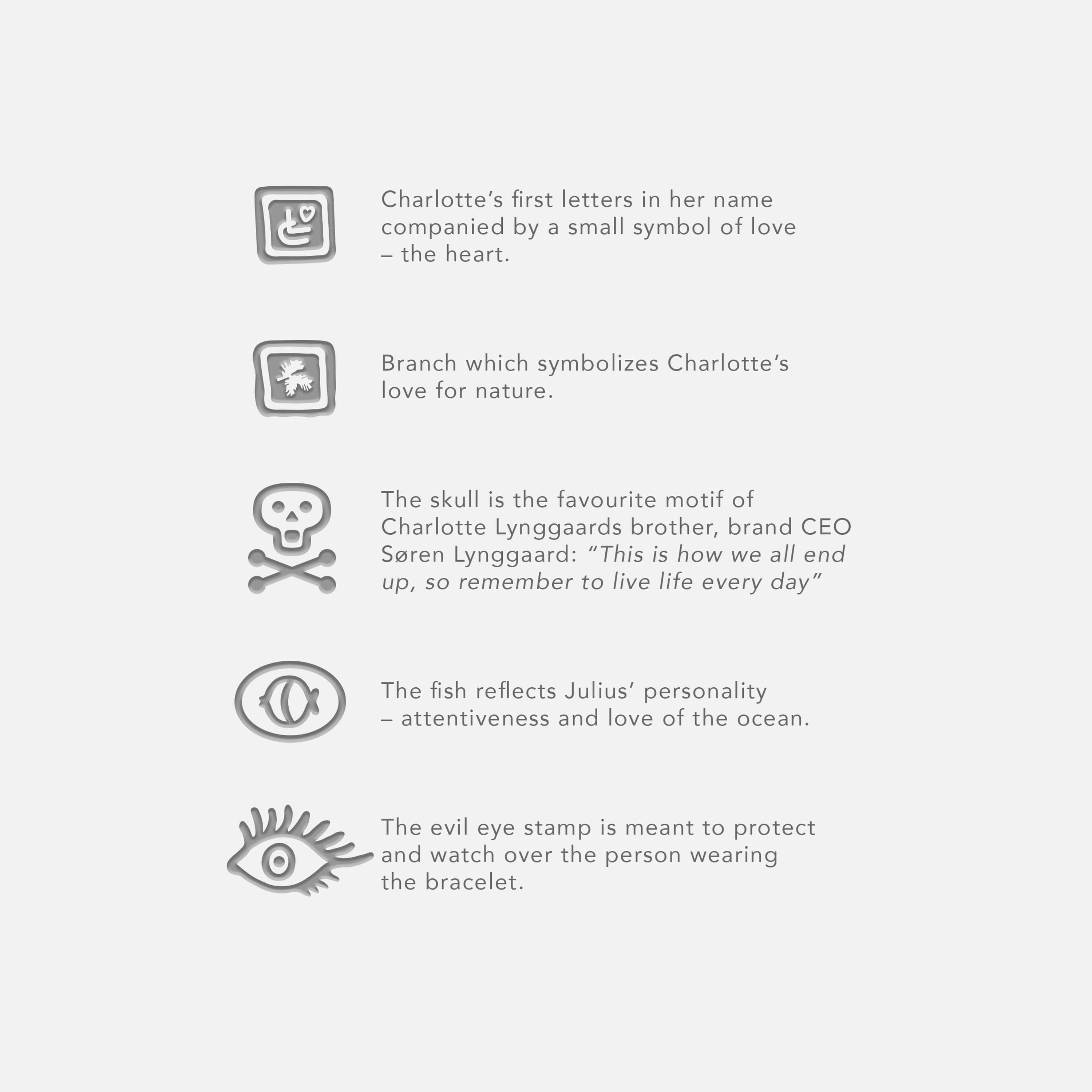 Charlotte Lynggaard created the stamped cuff bracelet as a Christmas present for her son, Julius. Each tiny stamp subtly represent something meaningful to the Lynggaard family.