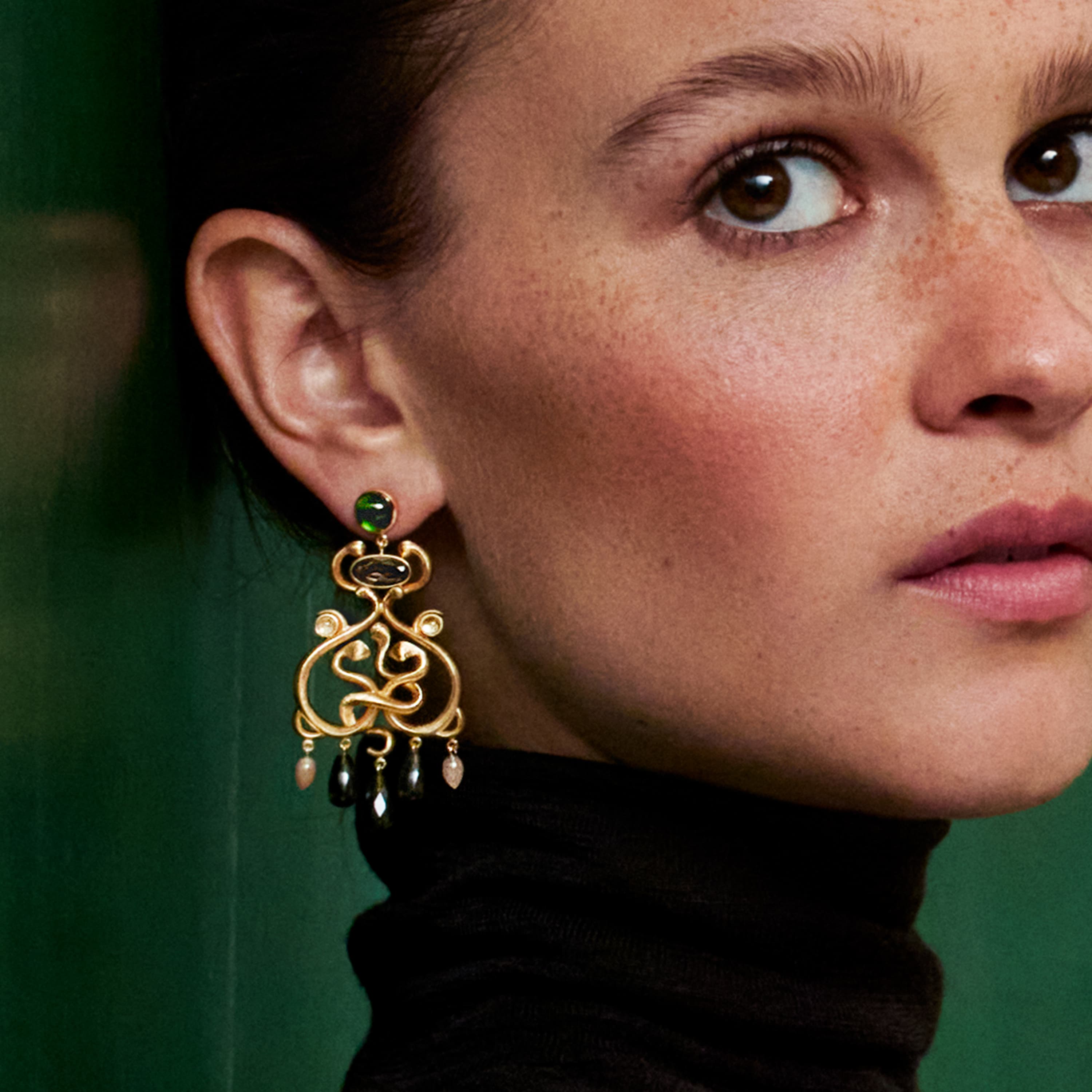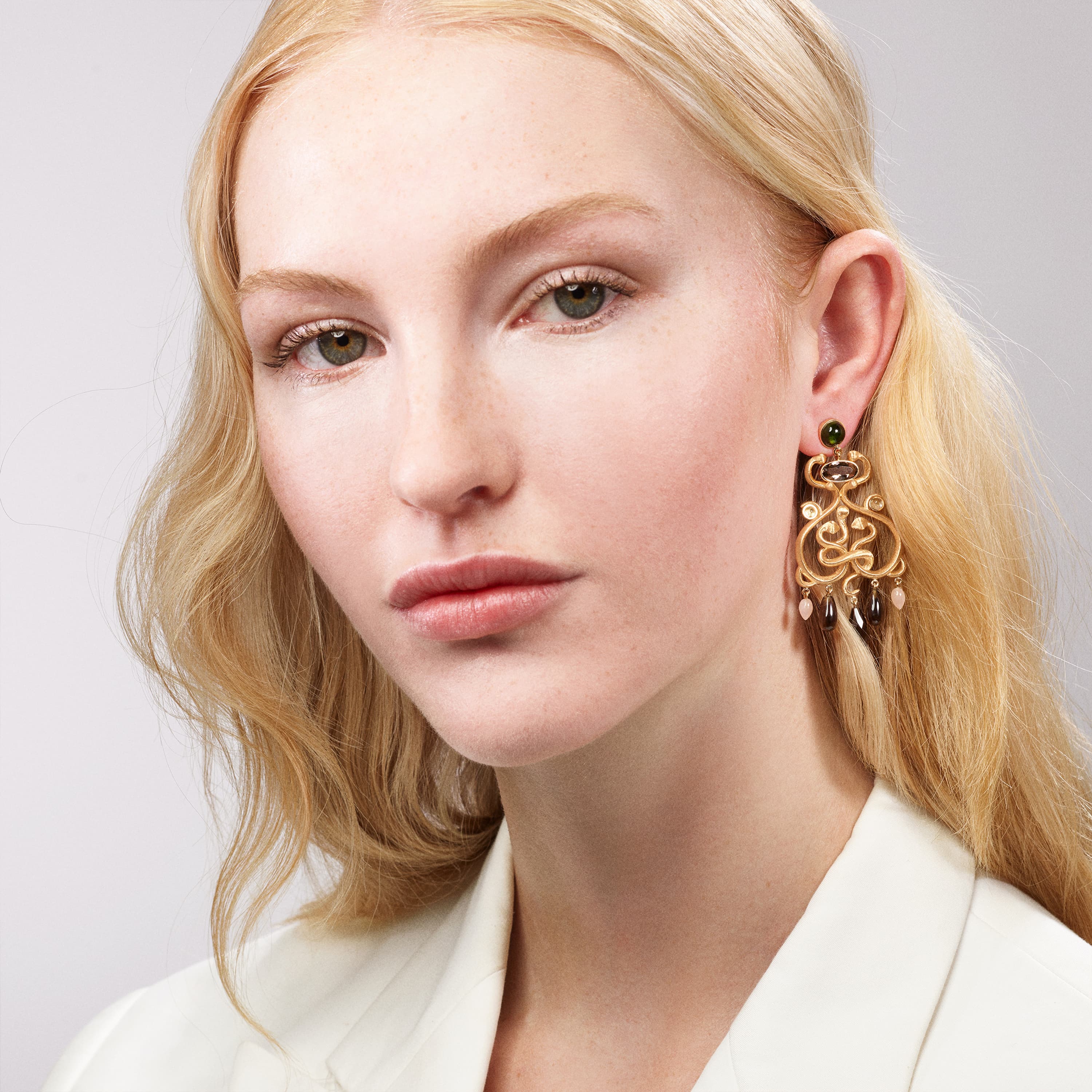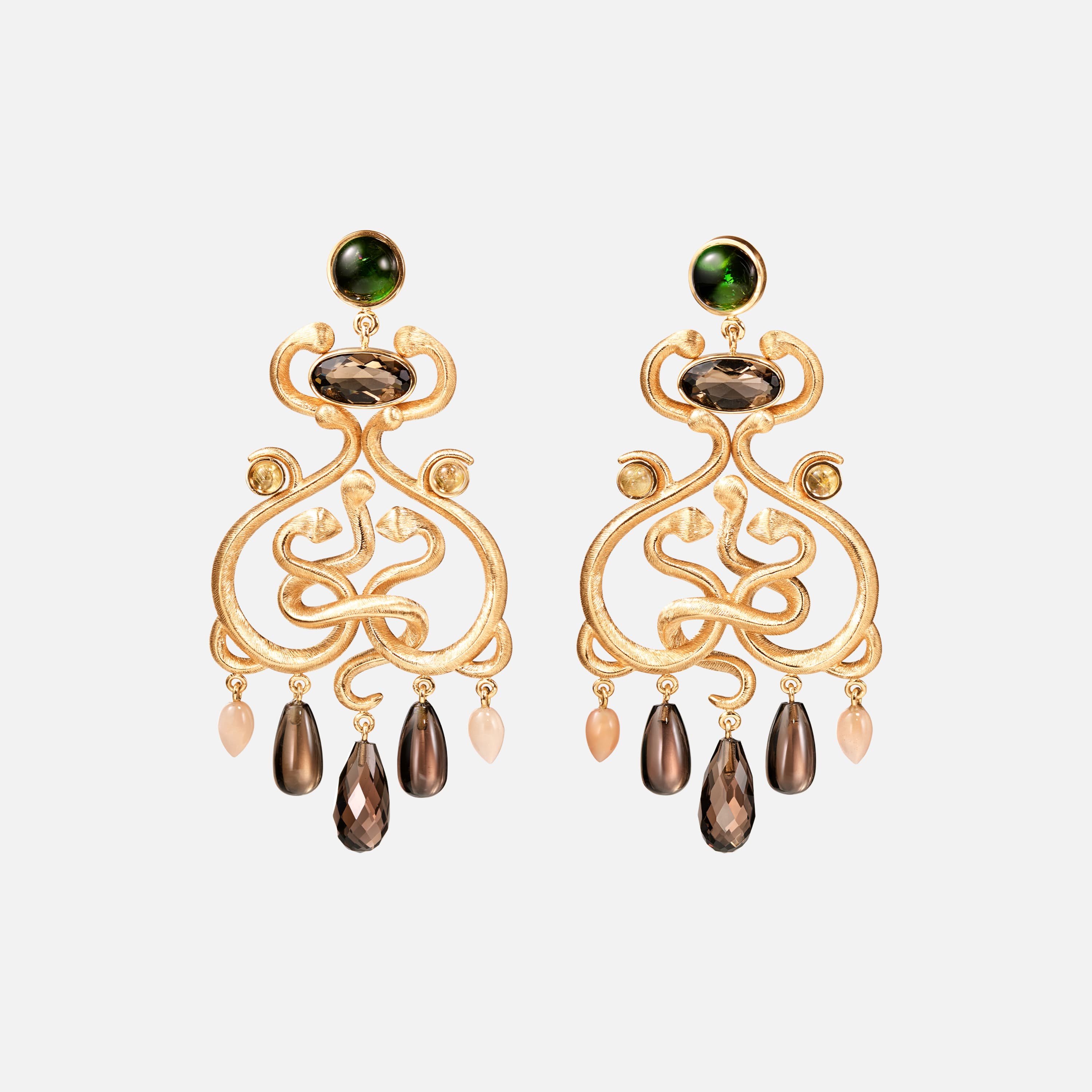 Designed by Charlotte Lynggaard, these Snakes chandelier earrings are crafted from 18 karat yellow gold. Each earring is set with two cabochon-cut green tourmalines, two facetted smoky quartz, two cabochon-cut smoky quartz, two cabochon-cut rutile quartz, and two blush moonstones. Sold as a pair. Part of The Gipsy Collection. Please note: As gemstones are natural materials, each stone is absolutely unique. They will vary in colour and have individual, unique inclusions and features. Web-images of stones are only representatives of the unique stone you will receive when ordering the product, not the exact stone.